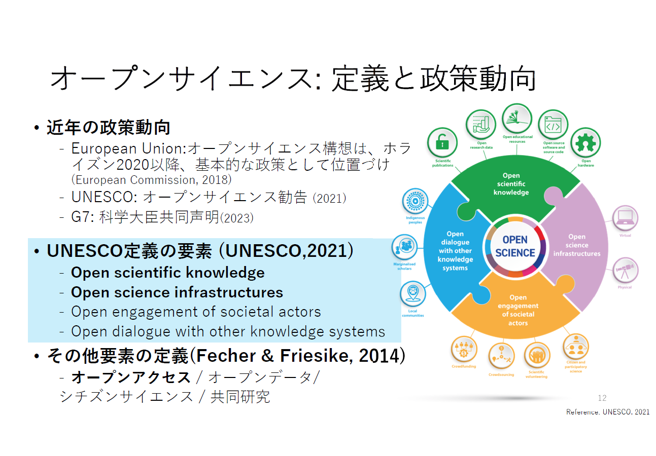 オープンデータは、オープンサイエンス運動の「オープンアクセス」と並ぶ中核的な要素であり、「研究で生成されたデータに対する制限のないアクセス、利用、変更、再配布」を指します。データはただ公開されるだけでなく、引用され「再利用」され、新たな研究が生まれる基盤となることで、費用便益の高い「研究資産」として認識されます。