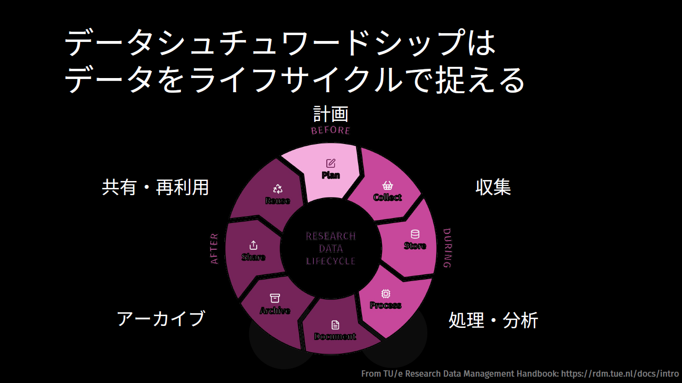 これに対し、データスチュワードシップは、研究データを「ライフサイクル」で捉える視点を提供します 。データが「計画(Plan)」され、「収集(Collect)」「処理・分析(Process/Analyse)」され、「出版(Publish)」された後も、「保存・共有・再利用(Preserve/Share/Reuse)」され、次の新しい研究の「計画」に繋がっていく──この循環を生み出すことが重要です。この活動の根本には、「データはみんなの財産である」という思想があり、公共の研究機関としてデータを適切に管理する責任があります。そして、こうしたことは2007年頃から言われてきたことですが、まだまだやるべきことが多くあると感じています。