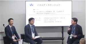 パネルディスカッションでは、ここまで講演された小泉様、甲斐様、野中様に登壇いただき、オープンサイエンス推進における押さえるべきポイントについてお話しいただきました。また、参加者からの質問にご回答されました。