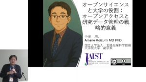 小泉様の講演では、学術情報は「公共財」であるとのオープンアクセスの理念、大学の果たす役割、APCの負担をめぐる日本の課題、政府の動向、転換契約の推進と研究データ管理へのクラウド活用の重要性、オープンアクセス時代における研究評価の在り方、そして今後の展望などについてお話しいただきました。