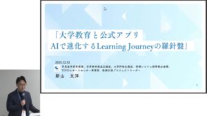 新山様のご講演では、東洋大学で開発した公式アプリについて、開発経緯やシンプルな機能、学生ニーズ把握や活用事例、AIツールによる学生の学びを支える機能をご紹介いただき、教職員が学生のことを考えるきっかけになったことをご説明されました。