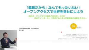 野中様の講演では、国のオープンアクセス基本方針を切り口に、インターネット時代における大学図書館の役割、機関リポジトリの意義、なぜ大学図書館がOAに関わるのかを、京都大学の事例を交えてご紹介いただきました。